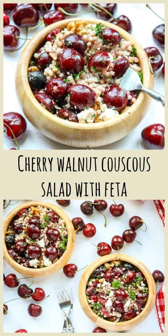 Besides the cherries, I used Israeli couscous in this delicious salad. Along with toasted walnuts, black olives, feta, and fresh lemon, it's a tasty and satisfying summer salad. It's great on its own for lunch, perfect for picnics, and a beautiful side dish for grilled chicken, pork, or fish.