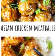 Garnish your Asian chicken meatballs with sliced green onions and/or sesame seeds. Serve meatballs as a healthy dinner with rice noodles, white rice, fried rice, or cauliflower rice. Add a vegetable side dish like miso baked sweet potatoes, green beans, or a tangy red cabbage slaw.