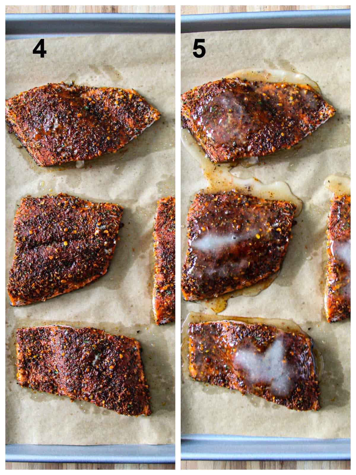 - Remove the salmon from the oven and spread the honey butter mixture over each fillet to coat.
